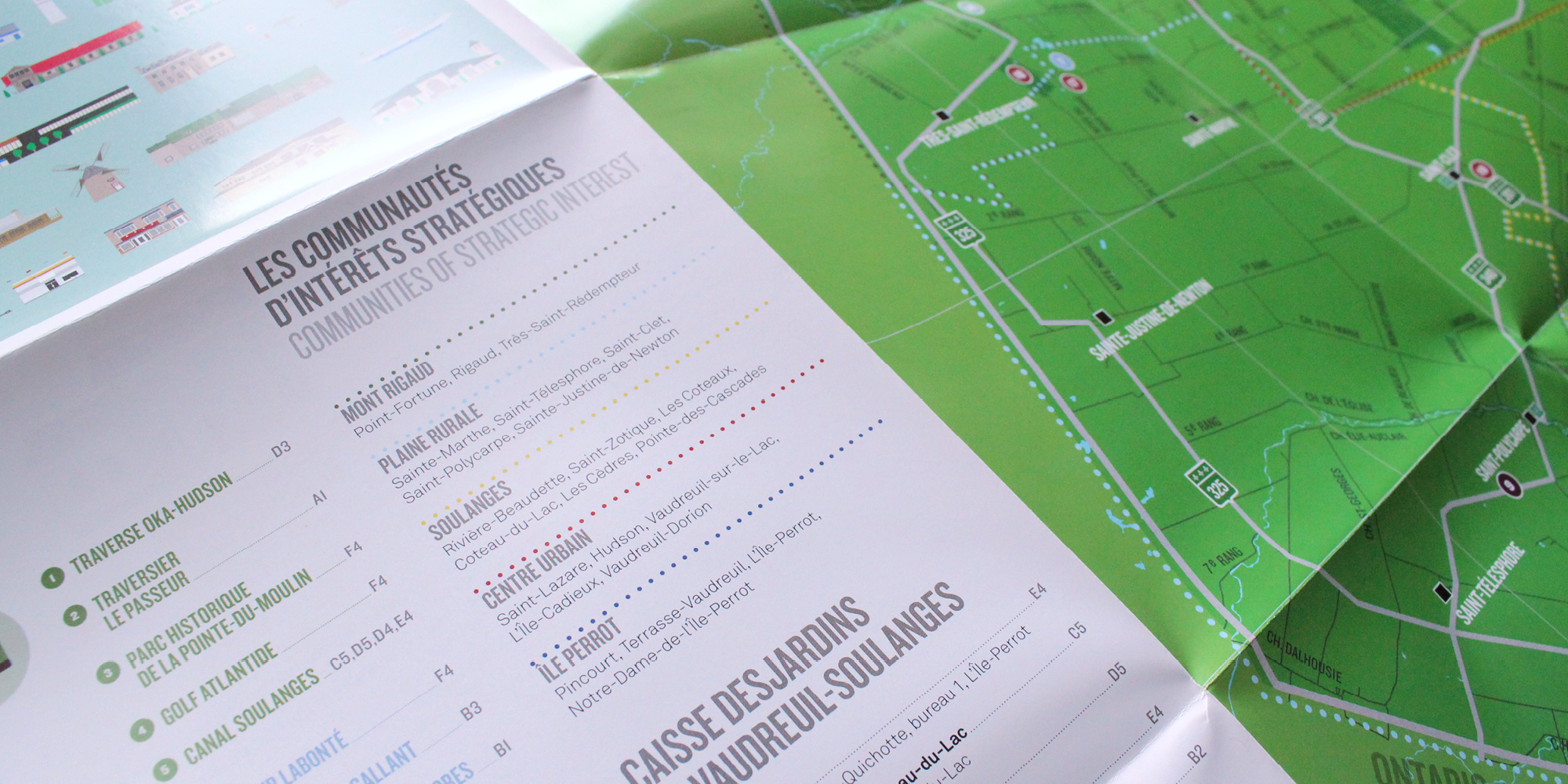 Le CLDVS a pour mission de stimuler l'économie locale et attirer les investisseurs dans la région de Vaudreuil-Soulanges. Comment offrir un nouveau regard sur les entreprises locales qui font briller le terroir? En brisant les conventions d'un outil promotionnel plutôt conservateur. Pour se faire, les façades des commerces et attraits ont été illustrées dans le plus grand souci du détail afin qu'il soit facile de les reconnaître. Un ton ludique et invitant a été donné à l'ensemble du document pour représenter l'effervescence économique et culturelle du secteur.
